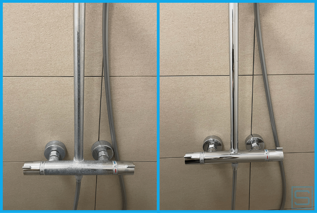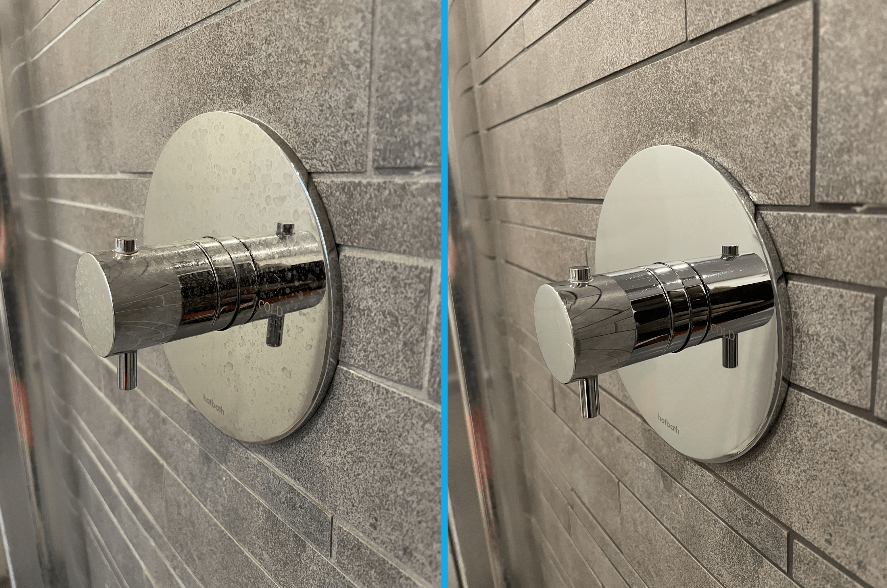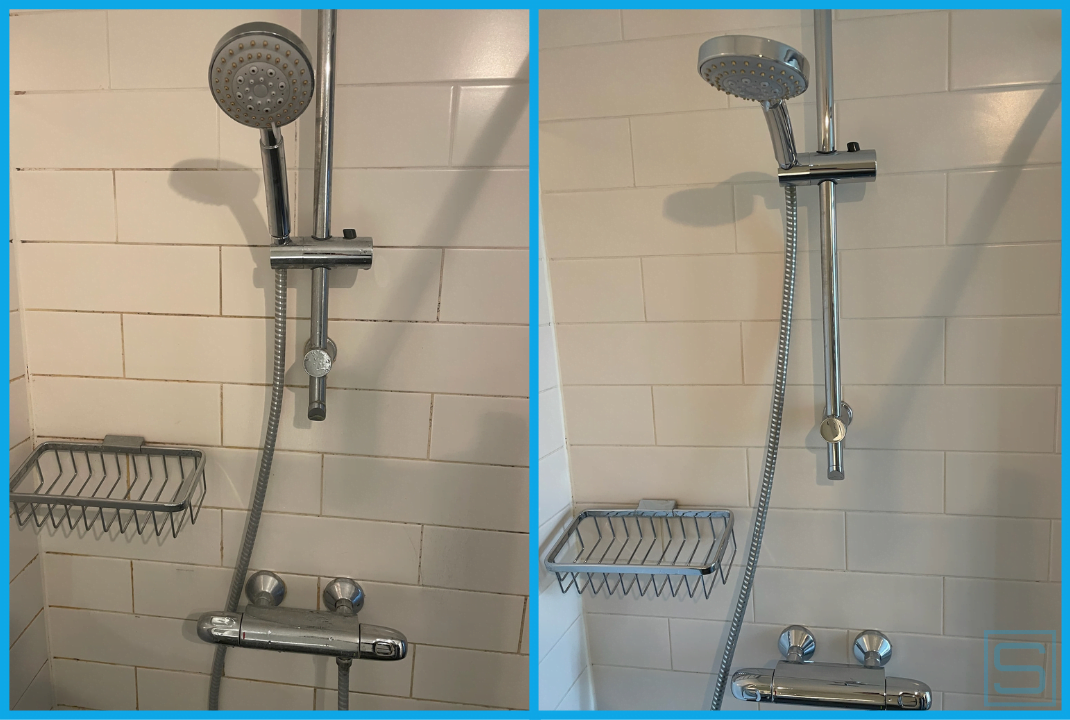 Na het ontvetten van de badkamer beginnen wij met het behandelen van kalkaanslag. Bij het behandelen van kalkaanslag passen wij een doordachte aanpak toe. Indien nodig maken wij gebruik van zuurhoudende producten, maar onze voorkeur gaat uit naar een milde, pH-neutrale pasta. Deze pasta is niet alleen effectief in het verwijderen van kalk, maar ook vriendelijk voor uw oppervlakken. Zo behouden we niet alleen de glans van uw badkamer, maar zorgen we er ook voor dat materialen niet onnodig worden blootgesteld aan agressieve chemicaliën.